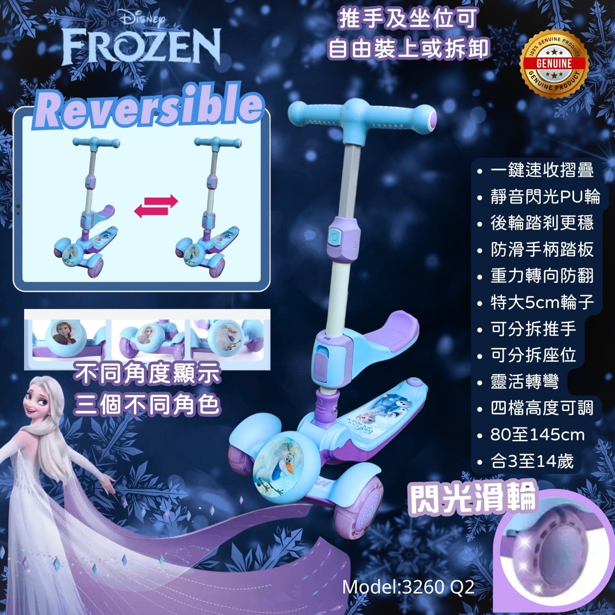 2025年新Disney Frozen 冰雪奇緣 2合1 3D加厚可推可坐帶閃光輪滑板車 frozen scooter s3260 Q2 Elsa 滑板車 frozen elsa scooter #兒童生日禮物 #聖誕禮物 #抽獎禮物 #交換禮物 #驚喜禮物 #新年禮物 #獎勵計劃禮物 Model: s3260 Q2 二合1 原價:$665 特價:2合1 帶坐位款 自取/順豐到付 $565 *另有3合1 附有家長推手柄滑板車 伴隨小朋友成長和『座位』都是可裝可拆,可隨小朋友成長情況需要去組合。 1。SUV級加寬加厚車身,更穩更安全 2。重力轉向系統 3。後輪漸進式剎車系統 4。炫酷閃光輪,動能發光 5。便攜一鍵折疊,一秒折疊便捷出行,輕鬆折疊不佔位 6。流線型防撞車頭 7。四檔調高度,陪伴小朋友成長,合3至14歲。 8。防滑手柄 10。防滑踏板 🌟四檔調高陪伴小朋友成長 四檔:80.5CM 使用年齡:10-14歲 三檔:76CM 使用年齡:8-9歲 二檔:71CM 使用年齡:6-7歲 原始檔:61CM 使用年齡:3-5歲 🌟一秒折疊單手提拎 轉彎更靈活寬輪更穩當,小朋友更易上手 🌟炫酷閃光輪 車輪內置燈珠,電磁感應原理設計無需用電,一滑就亮,持久閃爍 🌟SUV級加寬加厚車身,更穩更安全。新款加大寬輪,安全更穩定。 🌟升級重力轉向 安全重力轉向系統依靠孩子的身體力量自然傾斜把手完成轉向。輪子重力轉向間隙大於12MM 保護小孩玩鬧時不會被夾到手指。 🌟冰雪奇緣滑板車🌟 車杆可調節4檔高度: 61CM-80.5CM 軸承: ABEC-7碳鋼軸承 產品款式: 冰雪奇緣/蜘蛛俠/Hello Kitty 最大承重: 踏板50kg (如購坐墊款20kg ) 輪子: 閃光高彈輪 產品材質: 面板PP+底板尼龍+手把TPE+鋁T形管+鋁中桿 輪子尺寸: 前輪120*50MM 後輪80*24MM 承重:座椅20KG・踏板50KG ・本貨品為平行進口正貨 ・帖文內容只作參考。 ・所有商標或版權均屬有關商品品牌商標的持有人 ・網購涉及運送過程,產品及外盒可能因此會有些擠壓痕跡,實屬難免,如不影響使用,不設退換。完美主義者,請考慮才購。 ・若運輸及快遞遇上不可坑力的廷誤,不設退款,請客人體諒,本公司一收貨就快發,務求客人盡快收貨。